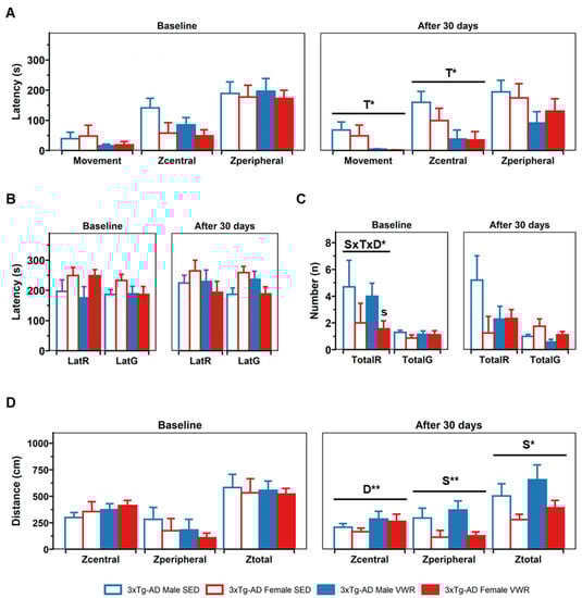 In the OF test, a 2 × 2 (sex × treatment) ANOVA showed a treatment effect after 30 days in the latency of movement (movement) [T, F(1,30) = 5.72, p = 0.023] and in the latency to start exploring the central zone (Zcentral) [T, F(1,30) = 7.25, p = 0.011] (Figure 3). A post hoc analysis yielded a reduction of these parameters in the group submitted to VWR compared with SED animals [VWR vs. SED, all t(16,18) > 56.6, p < 0.015, t-test]. Regarding vertical activity, a sex × treatment × days interaction was found [S × T × D, F(1,30) = 5.07, p = 0.032, Mixed ANOVA]. A further analysis showed that significance could be explained by sex differences in the VWR group at baseline [3xTg-AD male VWR vs. 3xTg-AD female VWR, t(7,9) = 2.4, p = 0.042]. No differences were found in the latency of rearing, the latency of grooming, or emotionality (urination and defecation boli) (data not shown). Finally, when the distance covered by the animals was analyzed, a days effect was found in the central zone [D, F(1,30) = 12.60, p = 0.001] with a decrease in all groups when retested [retest vs. baseline, t(34) = 3.66, p < 0.001, paired t-test]. Moreover, sex effects were found in the periphery [S, F(1,30) = 7.98, p = 0.008] and total field [S, F(1,30) = 6.02, p = 0.02] after 30 days with males covering more distance.