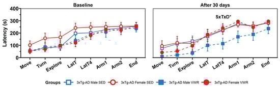 The TMSA (Figure 4 test showed no differences in the latencies related to freezing behavior (to move and turn) and exploration; namely, the time until start to explore (Explore), reach the intersection (LatT), and the time spent until reaching the first (Arm1) and second (Arm2) arm of the maze, and the test completion criteria (End) [All Fs(1,29) < 3.49, p > 0.05, mixed ANOVA]. However, a sex × treatment × days interaction was found in the time elapsed until crossing the intersection with their four paws (LatT4) [F(1,29) = 4.80, p = 0.037, mixed ANOVA] after 30 days, with 3xTg-AD males VWR reaching this goal in a shorter time compared with 3xTg-AD females VWR [t(7,8) = −2.20, p = 0.048, t-test]. Moreover, considering the goals in the TMSA ethogram as a whole (pooled data), a trend is observable with better performance of the 3xTg-AD males VWR compared with all other groups [S × T × D, F(1,29) = 3.90, p = 0.058] in the retest. Instead, no significant differences were found after 30 days in the number of errors and vertical activity (rearings and grooming) in the test (data not shown).