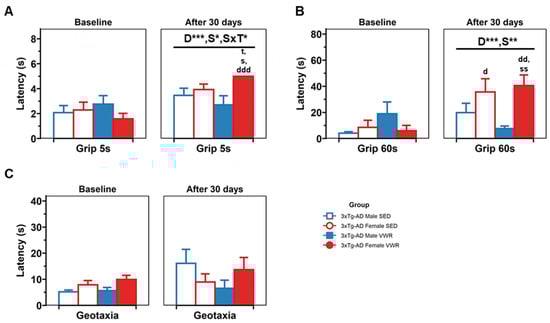Sensorimotor assessment. (A) Muscular strength at baseline and after 30 days. (B) Muscular endurance at baseline and after 30 days. (C) Geotaxia at baseline and after 30 days. Factorial analysis: D, days; T, treatment; S, sex. t < 0.05. * p < 0.05; ** p < 0.01; *** p < 0.001; d < 0.05, dd < 0.01 and ddd < 0.001 vs. the same group at baseline; s < 0.05 and ss < 0.01 vs. male counterpart in the same treatment group.