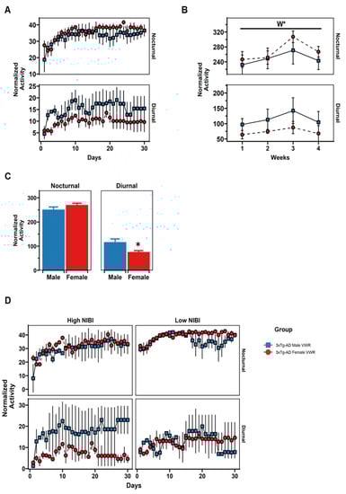 When the mean total activity per week was considered (Figure 7C), significant sex differences were found during diurnal periods, with males performing higher level than females [males vs. females: t(16,16) = 2.30, p = 0.031, t-test].