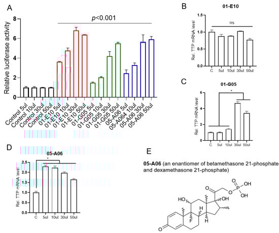 Dose-dependent induction of TTP in MDA-MB-231 cells by three compounds selected from the fourth screening of the natural compound library. (A) Dose-dependent changes in luciferase activity. MDA-MB-231 cells were transfected with pGL3/TTPp-1343 luciferase reporter vector containing the human TTP promoter, followed by stimulation with different concentrations of three selected compounds solubilized in DMSO for 48 h. The same volume of DMSO was added to the cells as controls. For each compound, the fold change in luciferase activity of stimulated cells was calculated relative to that of the DMSO control. The graphs are mean ± SD of three independent experiments (Two-way ANOVA). Black bars, control; red bars, 01-E10; green bars, 01-G05; violet bars, 05-A06. (B–D) Dose-dependent changes in endogenous TTP level. MDA-MB-231 cells were stimulated with different concentrations of compounds (B) 01-E10, (C) 01-G05, and (D) 05-A06 for 48 h. The expression level of TTP mRNA was analyzed by qRT-PCR. For each compound, the fold change in expression level was calculated relative to that of the DMSO control. The graphs are mean ± SD of three independent experiments (one-way ANOVA, * p < 0.01). (E) Structure of compound 05-A06, an enantiomer of BTM-21-P and DXM-21-P.