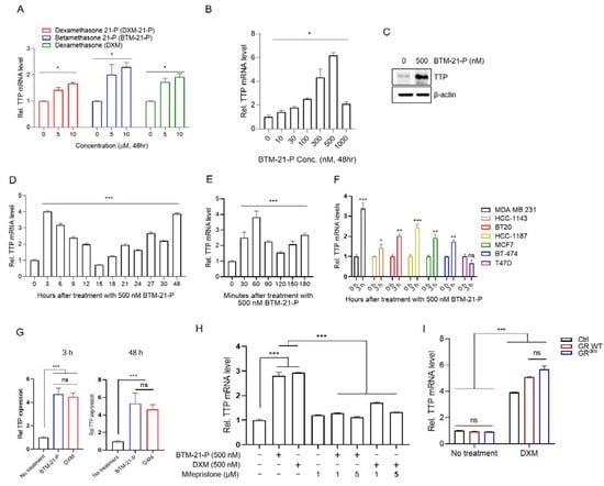 Induction of TTP expression by BTM-21-P, DXM-21-P, and DXM in breast cancer cells in a glucocorticoid receptor (GR)-dependent manner. (A,B) Dose-dependent changes in TTP expression level in MDA-MB-231 cells. MDA-MB-231 cells were stimulated with the indicated concentration of BTM-21-P, DXM-21-P, or DXM for 48 h. The expression level of TTP was analyzed by qRT-PCR. For each compound, the fold change in expression level was calculated relative to that of the DMSO control. The graphs are mean ± SD of three independent experiments (one-way ANOVA, * p < 0.01). (C) Western blotting analysis for TTP in MDA-MB-231 cells stimulated by 500 nM BTM-21-P for 48 h. (D,E) Time-dependent changes in TTP expression level in MDA-MB-231 cells. MDA-MB-231 cells were stimulated with 500 nM BTM-21-P for the indicated times. The expression level of TTP mRNA was analyzed by qRT-PCR. Fold change in expression level was calculated relative to that of the DMSO control. The graphs are mean ± SD of three independent experiments (one-way ANOVA, *** p < 0.001). (F) Effects of BTM-21-P on TTP expression in several breast cancer cell lines (MDA-MB-231, HCC-1143, BT20, HCC-1187, MCF-7, BT-474, and T47D) stimulated with 500 nM BTM-21-P for 3 h. The expression level of TTP was analyzed by qRT-PCR. Fold change in expression level was calculated relative to that of the DMSO control. The graphs are mean ± SD of three independent experiments (Student’s t test, * p < 0.01; ** p < 0.005; *** p < 0.001). ns, not significant. (G) Comparison of the effects of BTM-21-P and DXM on TTP expression in MDA-MB-231 cells. MDA-MB-231 cells were stimulated with 500 nM BTM-21-P or 500 nM DXM for 3 h or 48 h. The expression level of TTP mRNA was analyzed by qRT-PCR. Fold change in expression level was calculated relative to that of the DMSO control. The graphs are mean ± SD of three independent experiments (Student’s t test, *** p < 0.001). ns, not significant. Blue bars, BTM-21-P; red bars, DXM. (H) The effect of the GR inhibitor on the BTM-21-P- and DXM-mediated induction of TTP expression in MDA-MB-231 cells. MDA-MB-231 cells were treated with indicated concentrations of the GR inhibitor mifepristone for 30 min, followed by stimulation with 500 nM BTM-21-P or 500 nM DXM for 3 h. The expression level of TTP mRNA was analyzed by qRT-PCR. Fold change in expression level was calculated relative to that of the DMSO control. The graphs are mean ± SD of three independent experiment (one-way ANOVA, *** p < 0.001). (I) The effect of dimerization-defective GR (GRdim) on the DXM-mediated induction of TTP expression in MDA-MB-231 cells. MDA-MB-231 cells were transfected with empty vector, pGR, or pGRdim, followed by 500 nM DXM for 3 h. The expression level of TTP mRNA was analyzed by qRT-PCR. Fold change in expression level was calculated relative to that of the DMSO control. The graphs are mean ± SD of three independent experiments (two-way ANOVA, *** p < 0.001). ns, not significant.