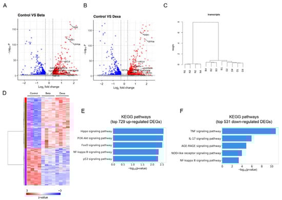 We performed RNA-Seq on total RNA samples (RIN above 8.5) collected from MDA-MB-231 cells at 4 h after treatment with growth media control, 500 nM DXM-21-P or 500 nM BTM-21-P. Residual DNA from each sample was removed using the RNeasyMinEluteCleanup Kit (Qiagen, Hilden, Germany). The cDNA library was prepared with 1.0 μg of total RNA using the TrueSeq RNA library Preparation Kit (Illumina, San Diego, CA, USA) following manufacturer’s recommendations, followed by paired-end sequencing (2 × 100 bp) using the HiSeq1500 platform (Illumina, San Diego, CA, USA). cDNAs were amplified according to the RNAseq protocol provided by Illumina and sequenced using an Illumina HiSeq 2500 system to obtain 150-bp paired-end reads. The sequencing depth for each sample was >20 million reads. RNA-seq reads were mapped using STAR 2.7.9a [] to the human genome GRCh38. Gene expression counts were measured using multicov implemented in bedtools []. Differentially expressed genes (DEGs) were obtained by comparing groups (Control, Beta, and Dexa) using EdgeR []. Genes with false discovery rate (FDR) <0.01 and log2fold change >0.3 were selected as DEGs. The DEGs were clustered using hierarchical clustering implemented in R. Ward’s criterion. Pearson’s correlation coefficient was used as a distance measure. A clustering heatmap was drawn using a z-score scaled across samples for each gene. The enriched KEGG pathway terms were obtained from Enrichr software [].