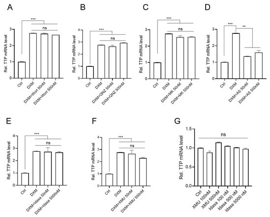 FOXO1 mediates DXM-induced TTP expression in MDA-MB-231 cells. (A–F) MDA-MB-231 cells were incubated with the indicated concentrations of inhibitors against (A) PI3K (Wortmannin) (B) NF-κB (QNZ), (C) AKT (MK2206), (D) FOXO1 (AS1842856), (E) MDM2 (Idasanutlin), and (F) MST1/2 (XMU-MP-1) for 12 h, followed by stimulation with 500 nM DXM for 3 h. The expression level of TTP mRNA was analyzed by qRT-PCR. Fold change in expression level was calculated relative to that of the DMSO control. The graphs are mean± SD of three independent experiment (one-way ANOVA, ** p < 0.005; *** p < 0.001). ns, not significant. (G) MDA-MB-231 cells were incubated in the presence of the indicated concentration of inhibitors against MST1/2 (XMU-MP-1) and MDM2 (Idasanutlin) for 12 h. The expression level of TTP mRNA was analyzed by qRT-PCR. Fold change in expression level was calculated relative to that of the DMSO control. The graphs are mean ± SD of three independent experiments (one-way ANOVA). ns, not significant.