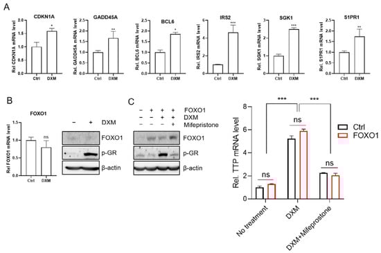 Previously it has been reported that glucocorticoids (GCs) induce the expression of TTP in cells [,,,]. However, the mechanisms underlying the GC-mediated TTP induction in cancer cells remain unclear. GCs are steroid hormones synthesized and released by the adrenal glands in response to physiological cues and stress []. GCs regulate fundamental body functions in mammals, including control of cell growth, development, metabolic homeostasis, cognition, mental health, immune homeostasis, and apoptosis [,,,]. Various synthetic GCs (e.g., prednisolone, aldosterone, dexamethasone, and betamethasone) have been developed by the pharmaceutical industry and serve as treatments for various diseases. Both natural and synthetic glucocorticoid hormones exert their biological effects predominantly via the glucocorticoid receptor (GR; NR3C1) [], a ligand-activated transcription factor that is constitutively and ubiquitously expressed throughout the body []. GR functions by regulating the expression of GC responsive genes in a positive or negative manner. Upon ligand binding, GR shuttles into the nucleus [] and binds to DNA sequences called glucocorticoid response elements (GREs) as a homodimeric complex []. The binding of GR homodimers to GRE sequences leads to an enhancement of gene expression []. GR also interacts with DNA as a monomer by binding to GRE half-sites and positively or negatively influences the transcription of target genes by interacting with promoter-bound STAT5, activator protein 1 (AP-1), or NF-κB transcription factors [,]. Independent of binding to GRE, monomeric GR can also regulate gene expression in a mechanism known as tethering, which involves physical interaction of monomeric GR with another transcription factor, such as AP-1 and NF-κB []. GCs also exert rapid non-genomic effects that do not require transcription processes or protein synthesis []. Interestingly, GCs not only increase the expression of FOXO [,,] but also increase FOXO activity [,] in a variety cells.