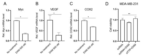 DXM-induced TTP mediates the anti-viability function of DXM in MDA-MB-231 cells. (A–C) DXM treatment decreases expression of ARE-containing genes in MDA-MB-231 cells. MDA-MB-231 cells were stimulated with 500 nM DXM, and the expression of ARE-containing genes such as (A) Myc, (B) VEGF, and (C) COX2 was analyzed by qRT-PCR. Fold change in expression level was calculated relative to that of the DMSO control. The graphs are mean ± SD of three independent experiments (Student’s t test, * p < 0.05). (D) TTP mediates the anti-viability function of DXM in MDA-MB-231 cells. MDA-MB-231 cells were transfected with TTP-specific siRNA (siTTP) or control scrambled siRNA (scRNA) and stimulated with 500 nM DXM. Viability of MDA-MB-231 cells was assessed using MTS assays. Graphs show relative cell viability. Data are mean ± SD of three independent experiments (one-way ANOVA, ** p < 0.01).