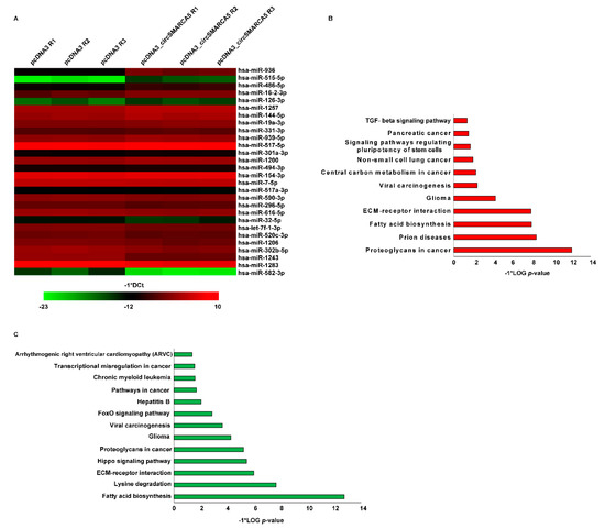 (A) Heatmap representation of the expression level of significant DE miRNAs in U87MG transfected for 24 h with the empty plasmid vector (pcDNA3) or with the plasmid vector expressing circSMARCA5 (pcDNA3_circSMARCA5). Data are represented as −1*DCt (the less its value, the less the expression of DE miRNAs; the higher its value, the higher the expression of DE miRNAs) for the three replicates (R1, R2, R3) of each experimental condition. (B,C) Enriched pathways (EPs) controlled by upregulated (B) and downregulated (C) miRNAs. Only significant (−1*LOG p-value ≥ 1.3) EPs are reported in the graphs.