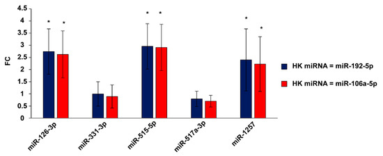 Expression of candidate DE miRNAs in U87MG overexpressing circSMARCA5. Data are reported as fold-change (FC) of the expression of candidate DE miRNAs in U87MG transfected with pcDNA3_circSMARCA5 vs. NCs. Red and blue bars show FC calculated by using miR-106a-5p and miR-192-5p as endogenous control (HK), respectively. The * p-value < 0.05 (n = 3, Student’s t-test).