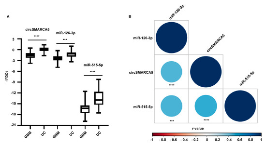 CircSMARCA5, miR-126-3p, and miR-515-5p are downregulated and positively correlated in GBM and UC biopsies. (A) Box and whisker plots representing the expression of circSMARCA5, miR-126-3p, and miR-515-5p in GBM and UC biopsies. Data are reported as −1*DCt. Statistical significance is indicated as p-value under the name of each transcript. (B) Correlogram showing correlations among circSMARCA5, miR-126-3p, and miR-515-5p. The colour of the circle is linked to the type of correlation (colours from light blue to dark blue and from light red to dark red are representative of positive and negative correlation, respectively); the size of the circle is inversely proportional to the p-value (the bigger is the circle, the less is the p-value). The r-values have been calculated by applying Spearman’s correlation test (*** p-value < 0.001, **** p-value < 0.0001).