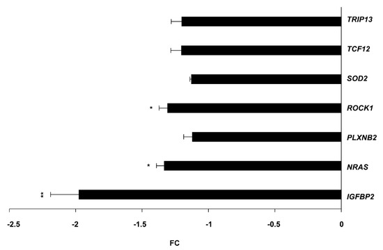 Expression of candidate DE miRNA targets in U87MG overexpressing circSMARCA5. Data are reported as fold-change (FC) of the expression of candidate miRNA targets in U87MG transfected with pcDNA3_circSMARCA5 vs. NCs. * p-value < 0.05, ** p-value < 0.01 (n = 3, Student’s t-test).