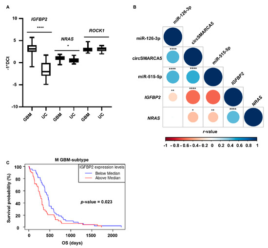 Expression of DE miRNA targets in GBM and UC biopsies. (A) Box and whisker plots representing the expression of IGFBP2, NRAS, and ROCK1 mRNAs in GBM and UC biopsies. Data are reported as −1*DCt. Statistical significance is indicated as p-value under the name of each transcript. (B) Correlogram showing correlations among circSMARCA5, miR-126-3p, miR-515-5p, IGFBP2, and NRAS. The colour of the circle is linked to the type of correlation (colours from light blue to dark blue and from light red to dark red are representative of positive and negative correlation, respectively); the size of the circle is inversely proportional to the p-value (the bigger is the circle, the less is the p-value). r-values have been calculated by applying Spearman’s correlation test (**** p-value < 0.0001, ** p-value < 0.01, * p-value < 0.05). (C) Kaplan–Meier overall survival (OS) curves of Mesenchymal (M) GBM-subtype patients, based on the expression of IGFBP2. Data were retrieved from Glioblastoma Bio Discovery Portal (GBM-BioDP).