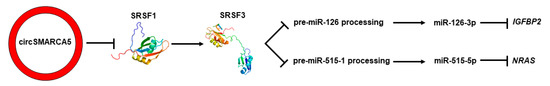 Collectively, our data suggest circSMARCA5 as an upstream regulator of the expression of TS miRNAs 126-3p and 515-5p and their downstream targets IGFBP2 and NRAS mRNA in GBM cells, extending our knowledge on the disrupted tumor suppressive pathways mediated by circSMARCA5 in GBM cells. Prospectively, these pathways may be considered for targeted molecular therapeutic approaches, especially by using recently discovered genomic editing techniques [103].