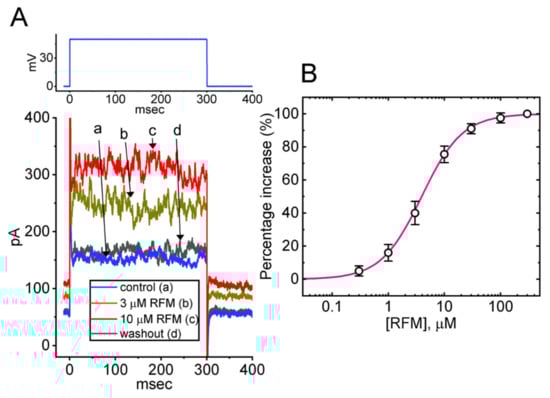 The IC50 values for the RFM-mediated inhibition of the peak and late INa in this study were estimated to be 22.7 μM and 3.1 μM, respectively. Our findings showed the effectiveness of RFM in causing the differential inhibition of the peak and late components of the INa in GH3 cells and in hippocampal mHippoE-124 neurons (see the Supplementary Information). In the continued presence of Tef, the addition of RFM led to an attenuation of the Tef-activated INa. It also needs to be emphasized that BKCa-channel activity has been identified in human cardiac fibroblasts []. It is thus possible that the added RFM interacts with BKCa channels to raise the amplitude of IK(Ca) in those cells which might be electrically coupled to heart cells.