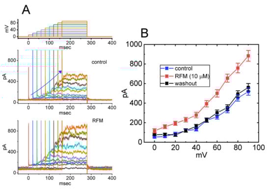 Although its mechanism of action as an antiepileptic drug is still unclear, RFM modulates the activity of NaV channels by prolonging the inactive state of these channels [,,,,,,] and the specific stabilization of the intermediate inactivated NaV channels []. It has previously been shown to improve functional and behavioral deficits through a mechanism linked to its blockade of tetrodotoxin-resistant Na+ currents []. However, whether this drug modifies the amplitude and gating of other types of ionic currents is unclear.