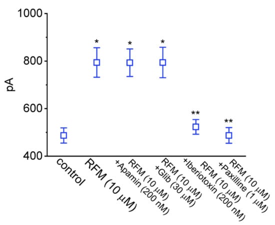 We next examined whether the subsequent addition of apamin, glibenclamide, iberiotoxin, and paxilline, while retaining the RFM, would alter the stimulatory effect of RFM on the IK(Ca) in GH3 cells. Evidence has been found that apamin blocks the activity of small-conductance Ca2+-activated K+ channels, glibenclamide is an inhibitor of ATP-sensitive K+ (KATP) channels, and iberiotoxin and paxilline are effective at suppressing BKCa-channel activity [,,]. As demonstrated in the scatter graph presented in Figure 3, in the continued presence of 10 μM RFM, the addition of neither apamin nor glibenclamide modified the RFM-induced increase in the amplitude of the IK(Ca). However, the subsequent addition of iberiotoxin and paxilline reversed the stimulation of the IK(Ca) produced by the presence of RFM. It, thus, seems likely that the RFM-mediated stimulation of the IK(Ca) is caused predominantly by the current flow through the BKCa channels present in GH3 cells.