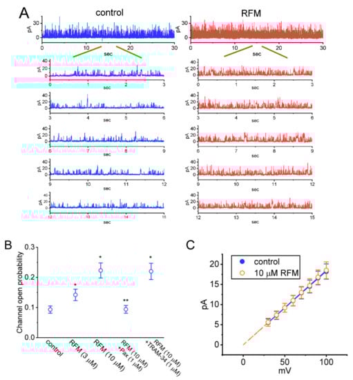 Effect of RFM on the activity of large-conductance Ca2+-activated K+ (BKCa) channels recorded from GH3 cells. The single-channel experiments were conducted as cells were exposed to high-K+ concentration (145 mM) containing 0.1 μM Ca2+, the pipette solution contained K+-enriched solution, and an inside-out configuration with a holding potential of +60 mV was created. (A) Representative tracings of BKCa channels in the absence (left, blue color) and presence (right, red color) of 10 μM RFM. RFM was applied to the bath medium. The lower five traces were expanded records from the uppermost current ones (15 s in duration) in the absence (left) and presence (right) of 10 μM RFM. The upper deflection indicates the opening event of the channel recorded at the holding potential of +60 mV. Of note, the BKCa-channel activity was conceivably enhanced as RFM was applied to the bath (i.e., in the cytosolic leaflet of the detached membrane patch). (B) Summary scatter graph demonstrating the effect of RFM, RFM plus paxilline, and RFM plus TRAM-34 on the probability of BKCa-channel openings (mean ± SEM; n = 7 for each point). Inside-out current recordings were performed in these experiments, the potential was set at +60 mV, and each tested compound was applied to bath medium. * Significantly different from control (p < 0.05) and ** significantly different from RFM (10 μM)-alone group (p < 0.05). (C) Mean I–V relationships of single BKCa-channel currents acquired in the absence (blue filled circles) and presence (orange open circles) of 10 μM RFM (mean ± SEM; n = 7 for each point). The dashed linear line was pointed toward 0 mV (i.e., reversal potential). Of note, these two linear I–V relationships of BKCa channels between the absence and presence of RFM are superimposed.