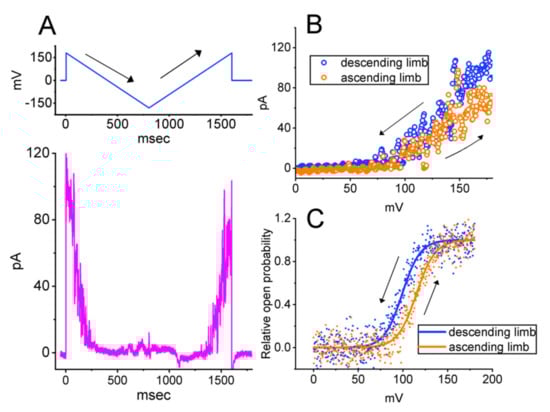 - Villalba-Galea, C.A.; Chiem, A.T. Hysteretic behavior in voltage-gated channels. Front. Pharmacol. 2020, 11, 579596. [Google Scholar] [CrossRef]