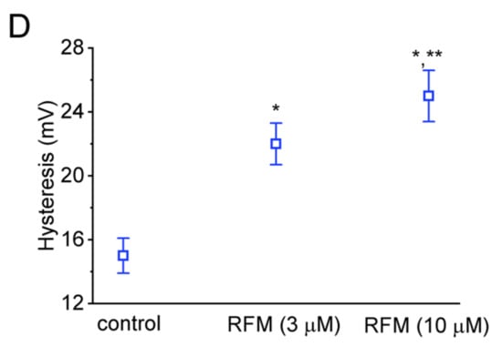 With the goal of quantifying our observations, we evaluated the degree of voltage-dependent hysteresis based on the voltage separation between the downsloping and upsloping branches at 50% of the relative probability of the BKCa channels being open. In a manner dependent on the concentration used, the presence of RFM increased the overall strength of the hysteresis exhibited by the BKCa channels in the GH3 cells (Figure 5D). More specifically, as the single-channel recordings were taken, the addition of 3 μM RFM led to an increase in the strength of the hysteresis to 22.1 ± 1.3 mV (n = 7, p < 0.05), whereas the addition of 10 μM RFM increased it to 25.1 ± 1.6 mV (n = 7, p < 0.05), from a control value of 14.9 ± 1.1 mV (n = 7).