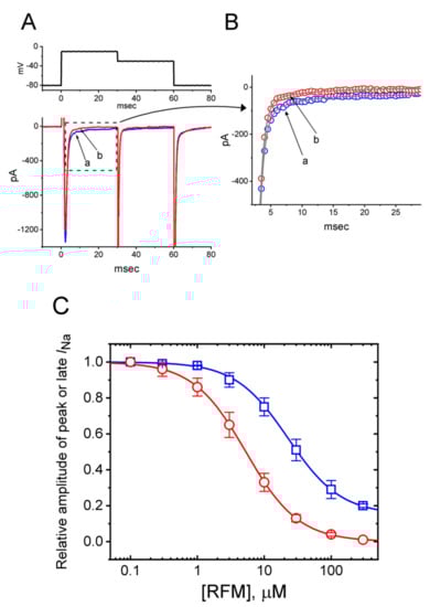 where [RFM] represents the different concentrations of RFM used; and nH and IC50 are the Hill coefficient inherent to the concentration-response relationship and the concentration at which the inhibition of 50% of the peak or late INa is observed, respectively. At this point, the maximal inhibition (1−a) of the peak and late INa was also estimated.