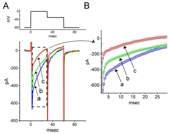 Shortly before each measurement, GH3 cells were gently dispersed, after which, a few drops of cell suspension were quickly placed into a custom-built recording chamber and allowed to settle at the bottom of the chamber. The recording chamber was positioned on the stage of an inverted phase-contrast microscope (Diaphot-200; Nikon; Lin Trading Co., Taipei, Taiwan) which was equipped with a video camera system with a magnification capability of up to 1500× magnification to monitor the cell size during the experiments. The cells were kept in a bath at room temperature (20–25 °C) in normal Tyrode’s solution containing 1.8 mM CaCl2. The patch electrodes were prepared from Kimax®-51 capillaries with a 1.5–1.8 mm outer diameter (#34500; Kimble; Dogger, New Taipei City, Taiwan) using a two-state PP-830 puller (Narishige; Taiwan Instrument, Tainan, Taiwan), and the tips were then fire-polished with an MF-83 microforge (Narishige). When filled with pipette solution, the resistances ranged between 3 MΩ and 5 MΩ. We performed standard patch-clamp recordings in the cell-attached, inside-out, or whole-cell configurations using an RK-400 amplifier (Bio-Logic, Claix, France) []. Junction potentials, which develop at the electrode tip when the composition of the intracellular solution differs from that of the bath, were nulled before the start of the formation of each gigaseal, and the junction potential corrections were then applied to the whole-cell data. During measurement, the recorded signals were stored online at 10 kHz or more with an ASUSPRO-BN401 LG laptop computer (ASUS, Tainan, Taiwan) equipped with a Digidata-1440A device (Molecular Devices; Advanced Biotech, New Taipei City, Taiwan) and controlled with the pCLAMP 10.6 software (Molecular Devices) [].
