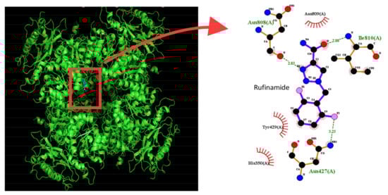 Docking results of KCa1.1 channel and rufinamide (RFM). The protein structure of the KCa1.1 channel was obtained from PDB (PDB ID: 6V3G), while the structure of RFM was acquired from PubChem (Compound CID: 129228). The structure of the KCa1.1 channel was docked with the RFM molecule through PyRx (https://pyrx.sourceforge.io/, URL accessed on 2 November 2022). The diagram of the interaction between the KCa1.1 channel and the RFM molecule was generated by LigPlot+ (https://www.ebi.ac.uk/thornton-srv/software/LIGPLOT/, accessed on 2 November 2022). Red arcs with spokes radiating toward the ligand denote the hydrophobic contact, while the green dotted line depicts the hydrogen bond.