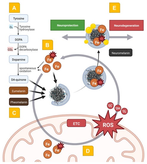 - Zucca, F.A.; Segura-Aguilar, J.; Ferrari, E.; Munoz, P.; Paris, I.; Sulzer, D.; Sarna, T.; Casella, L.; Zecca, L. Interactions of iron, dopamine and neuromelanin pathways in brain aging and Parkinson’s disease. Prog. Neurobiol. 2017, 155, 96–119. [Google Scholar] [CrossRef]