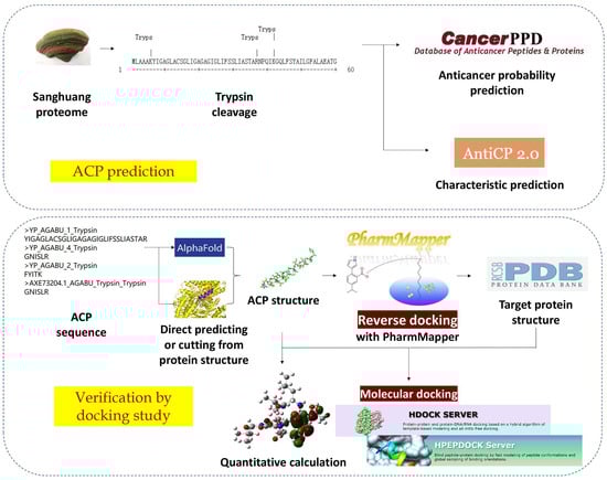 These bioinformatics methods were used to predict anticancer peptides in Sanghuang. The workflow is shown in Figure 1. The anticancer potential of Sanghuang protein and trypsin-digested fragments was predicted by mACPpred []. Our study used AntiCP 2.0 to predict the charge of possible ACPs and to demonstrate their anticancer potential from a mechanism perspective []. Through the blast function of the CancerPPD database, a known ACP with high similarity to one of the sequences and its ligand was found []. The structure of this peptide was simulated and HDOCK was used to perform molecular docking []. Two other hexapeptides successfully found cancer-related human target proteins in reverse docking provided by PharmMapper []. HPEPDOCK was used to perform molecular docking for these hexapeptides []. The successful docking results provide evidence that the detected ACPs have a high possibility of exerting anti-cancer functions. Our study also determined the active site of the anticancer peptide through quantitative calculations. The approach we have used in this study integrated several bioinformatics software to provide ideas for discovering anticancer peptides from traditional Chinese medicine and exploring possible mechanisms. The resulting anticancer peptides, from foods that are homologous to medicine, are expected to play a practical role in the treatment of cancer.