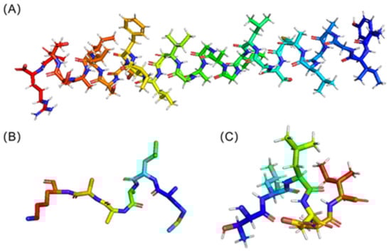 The sequence with the highest score and lowest E value was protein No. 2. To determine the likely mechanism, the structure of this peptide was predicted using AlphaFold 2 []. Figure 3A is the resultant 3D structure. Its secondary structure was α helix. Because the sequences were too short, neither AlphaFold 2 nor SWISS-MODEL can forecast the structure of protein No. 1 and protein No. 7. Through NCBI, we discovered the ACP-containing sequence, and after structural simulation by AlphaFold, we used PyMOL to truncate the ACP part. The resulting structures of protein No. 1 and protein No. 7 are shown in Figure 3B,C, respectively. The secondary structures of both hexapeptides were random coils.