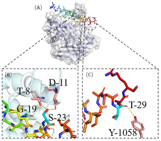 For ACPs of different lengths, HDOCK and HPEPDOCK were selected for protein-peptide docking [,]. We used HDOCK for protein No. 2 []. The online site provides the top ten models for docking scores. We downloaded the docking model with the highest docking score and displayed it with visualization software, as shown in Figure 4. Figure 4A shows the location of ACP docking in the target protein. Figure 4B,C show the hydrogen bonding interaction between ACP and target protein. The carbon atoms of the target protein’s interacting residues are highlighted in pink. Hydrogen bonds are depicted in the illustration as yellow dotted lines. Protein No. 2’s G-19, S-23, and T-29 form four hydrogen bonds with the proteins T-8, D-11, and Y-1058 of PTPRJ.