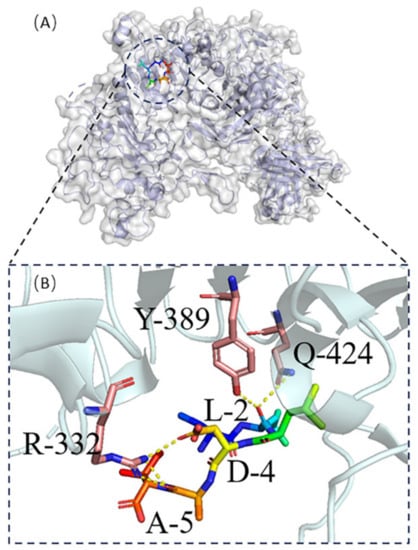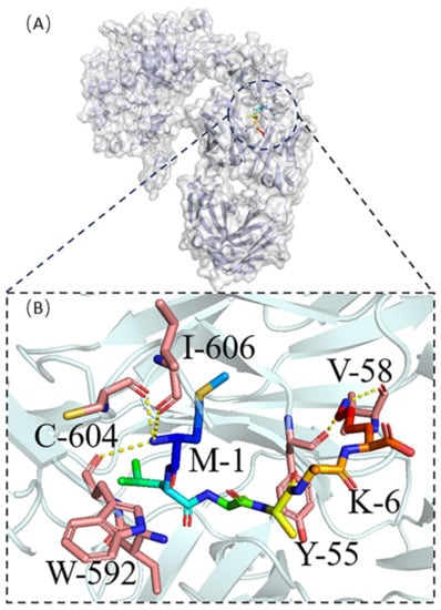 Molecular docking was carried out for both protein No. 1 and protein No. 7 using HPEPDOCK [] in Figure 5 and Figure 6, respectively. Protein No. 1’s M-1and K-6 made four hydrogen bonds with the target protein’s Y-55, V-58, W-592, C-604, and I-606 (Figure 5B). Five hydrogen bonds were obtained between protein No. 7’s L-2, D-4, A-5 and the target protein’s R-332, Y-389, and Q-424 (Figure 6B).