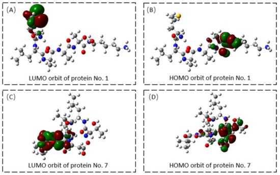 (A) LUMO orbit of Protein No. 1; (B) HOMO orbit of Protein No. 1; (C) LUMO orbit of Protein No. 7; (D) HOMO orbit of Protein No. 7.