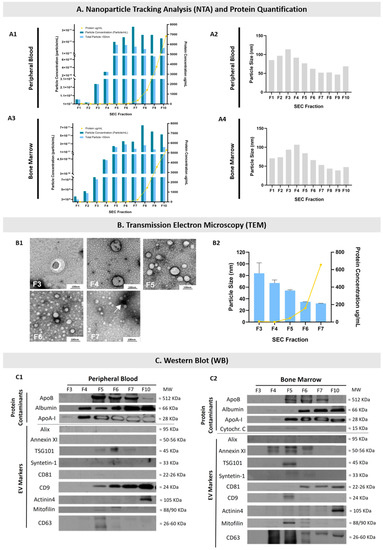 The presence of EV markers in fraction 10, mainly Actinin4 and CD9 in PB EVs and CD81, Actinin4, and CD63 in BM EVs, might be due to the presence of these proteins in a free form, as EVs are not expected to be obtained from fractions 8 to 10, as demonstrated by the NTA and TEM results.