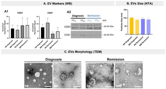 NTA results showed consistency regarding the EV sizes isolated from all samples (PB and BM at diagnosis and remission), which presented mean EV sizes between approximately 40 and 100 nm (Figure 2B), without statistically significant differences. This was confirmed by TEM (Figure 2C).