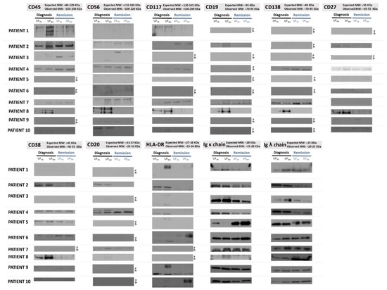 A total of 15 μg of the UF samples from the PB and BM patient samples and from the PB of healthy donors was denatured and separated by SDS-PAGE followed by WB using the same protocol and systems as described above. Antibodies (GE Healthcare Life Science, Chalfont St Giles, UK; Santa Cruz Biotechnology, Dallas, TX, USA; Abcam, Cambridge, MA, USA) for MM-specific markers (such as CD38 and CD138) were used, as well as other antibodies relative to the antigens used in the EuroFlow panel, such as CD19, CD27, CD45, CD81, CD56, CD117, and cytoplasmic lambda and/or kappa light chains [13,24] (Supplementary Tables S2–S4, and Figure S1).