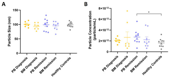 Comparison of the size and concentration of the EVs isolated by Size Exclusion Chromatography (SEC) and concentrated by ultrafiltration (UF) from Multiple Myeloma (MM) patients and healthy controls. (A) Average size of the isolated EVs from PB and BM samples of both diagnosis and remission MM patients and from healthy controls. Results are the mean ± standard error (SE) of the particle size obtained by NTA from at least six samples. (B) Particle concentration of the isolated EVs from PB and BM samples from both diagnosis and remission MM patients and from healthy controls. Results are the mean ± standard error (SE) of particle concentration obtained by NTA from at least six samples. * p < 0.05. PB: peripheral blood; BM: bone marrow; SEC: Size Exclusion Chromatography; UF: ultrafiltrated pool of SEC fractions 3 to 6; NTA: Nanoparticle Tracking Analysis; MM: Multiple Myeloma.