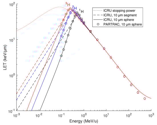 Energy depositions to the spherical lymphocyte nucleus by protons 1H, deuterons 2H and tritons 3H simulated with PARTRAC are presented in Figure 1 (symbols), where the nucleus-averaged LET is shown in dependence of the particles’ initial energy. For simplicity, the terms protons, deuterons and tritons denote the energy-dependent mixtures of charged states, e.g., 2H+ and 2H0. For comparison, the ICRU stopping power for protons in liquid water [,] is also presented in Figure 1. Here, the ICRU stopping power tables were used (i) to plot the local stopping power of hydrogen ions at the given energy per nucleon, which is identical for all 3 isotopes (dotted line); (ii) to calculate the LET integrated over a 10 µm track segment (relevant, e.g., for particles impinging on a cylindrical cell nucleus, parallel with its axis; dashed lines); or (iii) over a 10 µm diameter sphere (solid lines), with the given starting energy of the particles. As both the integrated stopping power values and PARTRAC simulations show, at low energies (< 1 MeV/u), the energy deposited to the nucleus (either spherical or cylindrical), and hence the nucleus-averaged LET, vary among the isotopes due to the kinematic effects: Deuterons, for instance, possess the same stopping power as protons of the same velocity, i.e., of the same energy per nucleon. Deuterons thus lose their energy at the same absolute rate as protons. However, as deuterons possess approximately twice the mass of protons, their energy (absolute, not per nucleon) is about twice as high, and the identical absolute energy loss actually means half the relative rate and translates into a longer range. Consequently, the energy deposited to the nucleus largely varies with the neutron number. For instance, 0.1 MeV/u deuterons deposit, to the spherical cell nucleus, about three times more energy than protons, and tritons twice more than deuterons. Above 1 MeV/u, there are virtually no differences between the energy deposited to the nucleus by protons, deuterons and tritons, since the energy loss over the track segment is sufficiently small compared with the particles’ energy, and hence the kinematic effects are negligible. Overall, the PARTRAC simulations on nucleus-averaged LET calculated from the energy deposited in the spherical nucleus (symbols) nicely match the integrated ICRU stopping powers for the same geometry (solid lines). The agreement is very good up to about 30 MeV/u. Above this value, the LET given by the energy deposited to the nucleus is somewhat smaller than the stopping power. This is due to the generated high-energy secondary electrons carrying a part of the energy away from the nucleus, both laterally and longitudinally, so that the stopping power fails to correctly represent the energy actually deposited to the nucleus.