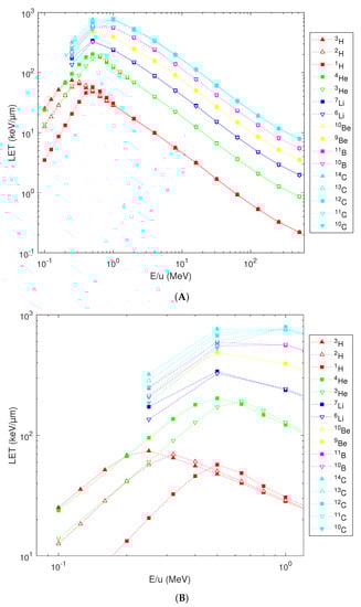 In this work, particle tracks were simulated for 1H, 2H, 3H; 3He, 4He; 6Li, 7Li; 9Be, 10Be; 10B, 11B; and 10C, 11C, 12C, 13C and 14C with initial energies of 0.25–512 MeV/u (0.1–512 MeV/u for H and He isotopes). Results on the different types of associated DNA damage were obtained from human lymphocytes, following the previously developed methodology and simulation setup []. The particles were started perpendicularly from random positions in a circular source (diameter 10.92 µm) tangential to the spherical model of lymphocyte nuclei (diameter 10.00 µm), with a random rotation of the source with respect to the nucleus to avoid artefacts from the alignment of tracks with axes of the chromatin fibre model []. The starting energy values were log-equidistant, with a step corresponding to a factor of 2, with additional values for H and He isotopes at low energies, where the simulations resulted in maximal isotope specificity. The primary particles as well as secondary and higher-generation electrons were followed in a spherical region of interest (diameter 14.22 µm) concentric with the nucleus, filled with liquid water as a surrogate for biological medium, as performed previously []. The size of this simulated region was selected so as to include the source as well as most electrons potentially leaving and re-entering the nucleus upon multiple scattering. Note, however, that this setup does not guarantee electronic equilibrium conditions. Simulations with a full electronic equilibrium would be computationally extremely expensive, as mm-sized regions would be needed; 512 MeV/u ions may liberate approx. 1.4 MeV secondary electrons, whose range in water is about 7 mm [].