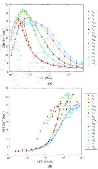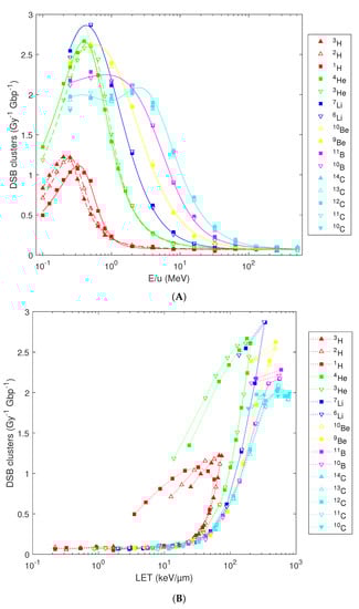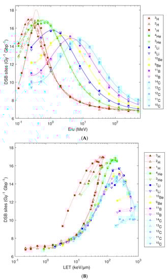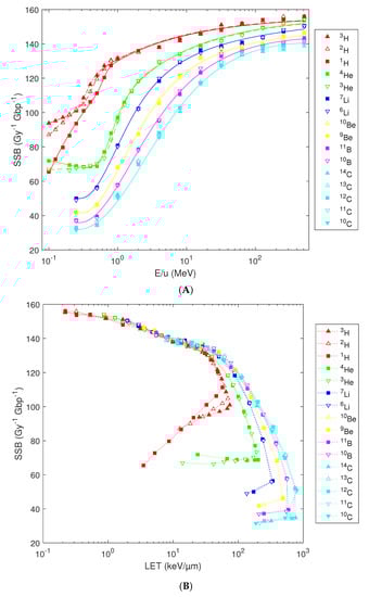 The separation of SSB yields with atomic number predominantly follows from differences in ionization density as captured by the nucleus-averaged LET []. Indeed, when plotted in dependence on the LET, this variability gets reduced; the simulation results for all isotopes follow a unique trend for LET < 10 keV/µm (Figure 3B). The reduction in SSB yields with decreasing energy (increasing LET) is largely due to the enhanced clustering of energy deposition events and hence the induction of more complex types of DNA damage, including DNA double-strand breaks (DSB). A drawback of the LET representation is that particles at two distinct energies, on proximal and distal parts of the Bragg peak, may possess an identical LET but a different efficiency in SSB induction, leading to hooks in the plots. Consequently, the simulation results cannot be fitted by a single function over the whole simulated range. Obviously, variations among isotopes at low energies also remain present in the LET-dependent plots.