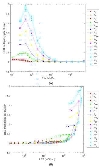 Finally, simulation results on mean cluster multiplicity (i.e., the mean number of DSB in a cluster) are presented in Figure 7, in dependence on energy per nucleon (panel A) or LET (panel B). Compared with heavier elements, hydrogen isotopes not only induce fewer DSB clusters (Figure 5A), but these typically consist of two DSB only, with a mean cluster multiplicity of 2.1 even for energies below 1 MeV/u, while clusters induced by 0.5 MeV carbon isotopes are on average composed of almost five DSB. Differences among diverse isotopes of the same element are marginal only.
