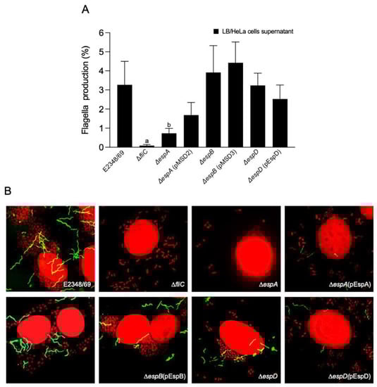 In the course of studies of EPEC flagella, we noted that strains carrying mutations in genes associated with assembly of the T3SS apparatus (espA, espB, and espD) or in secretion of T3 effectors (escN) were deficient in flagella production and motility []. Moreover, it was reported that mutants in espA or espB genes were unable to adhere efficiently (11% and 36% reduction, respectively) to host cells due to the inability to inject the translocated-intimin receptor Tir [,]. It is well known that the expression of flagella and the T3SS in EPEC is influenced by nutritional and host factors [,]. In this study, we wanted to further understand the functional relationship between these two T3SS machineries of EPEC. In the first set of experiments, EPEC E2348/69 isogenic mutants in genes that code for the EspA, EspB, and EspD proteins were cultured overnight in LB broth at 37 °C. HeLa cell monolayers were infected with 10 μL of the LB cultures and incubated for 3 h as described in Materials and Methods. After incubation, the supernatants were collected and the bacterial concentration was adjusted to an optical density at 600 nm (OD600) of 1.1 before analysis by flow cytometry using rabbit polyclonal anti-H6 antibodies as the probe. In parallel, the infected HeLa cell monolayers were washed and analyzed by immunofluorescence for the presence of flagella on bacteria adhering to these cells. The flow cytometry data showed that the ΔespA mutant produced 77.6% fewer flagella than the wild-type strain (p < 0.01) (Figure 1A).