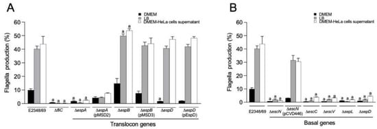 Flagella are surface appendages that propel bacteria towards nutrient-rich environments or help bacteria escape from environmental foes []. Motility is considered beneficial for bacterial pathogens for colonization of host mucosal surfaces generally bathed by a protective mucus gel. Many illness-causing bacteria inject numerous effector proteins, which have specific targets in host cells as part of the pathogenic scheme [,,]. The injection of these effectors is achieved by a needle-like secretion machinery called the T3SS. Structural analysis of the basal bodies of the T3SS and flagella revealed striking similarities. Both virulence-associated machineries are strictly regulated by specific genetic elements and regulatory networks in response to specific environmental conditions [,,,,,]. Virulence-devoted regulators are also known to modulate flagellation and the production of the injectisome according to the host’s niche to ensure that they are most efficient during interaction with the host cell. In addition, in pathogenic bacteria such as S. enterica, Y. enterocolitica, and P. aeruginosa, the flagellar regulon exerts a negative effect over the production of T3SS. Conversely, previously published data showed that EPEC mutants lacking or defective in T3SS function are also defective in flagella production and motility when growing in DMEM []. Thus, it is apparent and conceivable that a molecular cross-talk exists between flagella and the T3SS, which, in this study, we sought to address. We began by studying the production of flagella in mutants (ΔespA, ΔespB, and ΔespD) defective in assembling the secretory needle, which is built up of polymerized EspA, at the tip of which, the EspB and EspD proteins sit and form a pore through the host cell membrane. First, we analyzed flagella production in bacteria after 3 h-incubation with HeLa cells, in which the inoculum for these infections was originated from LB cultures. The ΔespA mutant was unable to produce flagella and to swim while the ΔespB and ΔespD mutants produced a similar number of flagella to the wild-type strain. The complementation in trans of the ΔespA mutant restored flagellation. We also inquired about the role of growth media (LB, DMEM) as well as the presence of HeLa cells in expression of fliC and production of flagella using DMEM cultures as inocula. Growth in either LB or DMEM repressed flagella production in the ΔespA mutant. However, the ΔespB and ΔespD mutants produced flagella after growth in LB and in the presence of HeLa cells. The data strongly suggest that an intact EspA needle is required for flagella to be optimally produced. fliC transcription in the ΔespA mutant was reduced by 50% with respect to E2348/69 when growing in LB, 25% in DMEM, and 20% in the presence of HeLa cells. The presence of fliC mRNA in this mutant does not account for the demonstrated lack of flagella. Thus, it is possible that other post-transcriptional or translational effects are responsible for the absence of flagella in the ΔespA mutant.