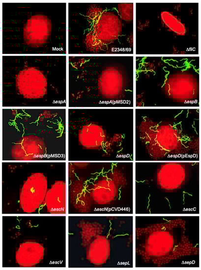 Next, we inquired about the requirement of other structural basal components of the T3SS translocon in flagella assembly. We used isogenic mutants unable to produce EscN (ATPase that provides energy for secretion and translocation), EscC and EscV (basal T3SS components), and SepD and SepL, which regulate the secretion of effector molecules. A mutation in escC or escV genes, render the bacteria unable to assemble a T3SS structure on the surface and to adhere efficiently to host cells []. The ΔsepD and ΔsepL mutants are affected in secretion of effectors and in adherence to cultured cells [] and a mutation in escN results in the lack of secretion of effectors and poor cell adherence [,]. In contrast to the wild type, we found that the ΔescN, ΔescC, ΔescV, ΔsepL, and ΔsepD strains produced significantly lower levels of flagella after growth in LB or DMEM or in the presence of HeLa cells (p < 0.001) (Figure 2B). However, when adhering to HeLa cells, only a few flagella filaments were detected in the ΔescN, ΔescC, ΔescV, ΔsepD, and ΔsepL mutants (Figure 3 and Table 1). These data are in agreement with the flow cytometry data. These strains were poorly adherent at 3 h of incubation, which can also explain the poor levels of flagella seen by immunofluorescence. The ΔescN mutant complemented in trans with escN on plasmid pCVD446, showed many more flagella and more adhering bacteria than the ΔescN mutant, as expected. No complemented strains were available for the ΔescC, ΔescV, ΔsepD, and ΔsepL mutants. These data indicate that when the T3SS apparatus is missing or non-functional there is no flagella assembly.