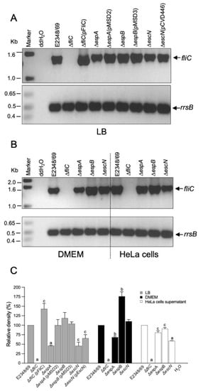 Given that most of the mutants in T3SS genes lacked or were deficient in flagella production we monitored fliC expression by RT-PCR to determine if the mutations were affected at the level of fliC transcription. All of the strains seemed to express fliC (Figure 4A,B). However, when the different strains were analyzed by a semi-quantitative digital analysis, a significant reduction in the expression of fliC was detected in the ΔespA and ΔescN mutants when they were grown in LB (~55% reduction) or incubated with HeLa cells (20% and 42% reduction, respectively) with respect to the E2348/69 strain (Figure 4C). Interestingly, incremental fliC expression was detected in the ΔespB mutant in LB (18%) and DMEM (79%) (p < 0.01). In all, these results suggest that the repression of flagella seen in the T3SS mutants is not at the transcriptional level, but at the post-transcriptional level.