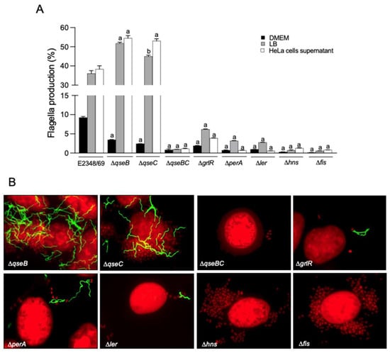 To further elucidate if the hypothetic cross-talk between flagella and T3SS was dependent on virulence or global regulators, we determined flagella production in ΔqseB, ΔqseC, and ΔqseBC quorum-sensing mutants, ΔgrlR, ΔperA, Δler, Δhns, and Δfis. While H-NS and Fis are global regulators of house-keeping and virulence genes [,], the two-component system QseBC regulates quorum sensing, virulence factors, and the expression of flagella and motility in EHEC []. Interestingly, the ΔqseB and ΔqseC mutants produced abundant flagella when growing in LB (p < 0.001 and p < 0.01, respectively) and in the presence of HeLa cells (p < 0.001), but were significantly reduced in flagella synthesis in DMEM (Figure 5A). These data indicate that these quorum sensing regulators function also as repressors of flagella transcription. In contrast, the remaining mutants analyzed showed poor levels of flagella production in all the conditions tested, which suggests that PerA, H-NS, and Fis activate flagella production (Figure 5). The immunofluorescence data shown correlated with the flow cytometry data (Figure 5B and Table 1).