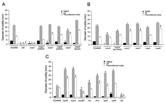 Motility of strains mutated in virulence and global regulators. (A–C) Motility of the indicated strains grown in LB, DMEM and preconditioned DMEM containing 0.3% agar. The data shown are the mean of three experiments performed in triplicate on different days. Letters a, b, or c show the statistical significance of the mutants tested with respect to E2348/69 grown in each condition (one-way ANOVA test, followed by Tukey’s multiple comparison), a = p < 0.001; b = p < 0.01; c = p < 0.05.