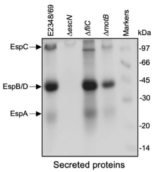 Flagella mutants of P. aeruginosa PAO1 produce more T3SS needle structures than the wild-type strain [,]. Conversely, EPEC T3SS mutants produce little to no flagella (Figure 1, Figure 2 and Figure 3). The data above indicate a strong correlation between expression of the T3SS and flagella in EPEC. We were interested in knowing if T3 protein secretion was affected in mutants possessing T3SS but lacking the flagellin gene (ΔfliC mutant) or a ΔmotB mutant unable to rotate flagella. We sought the known secreted proteins Tir, EspB, EspD, and EspA, in DMEM cultures as previously described []. Further, actin condensation was determined in HeLa cells as an indication of T3SS function in host cells and consequently of the production of attaching and effacing lesions. As shown in Figure 7, secretion of the most abundant secreted proteins Tir, EspB/D, and EspA was not affected in the ΔfliC and ΔmotB mutants as compared to the wild-type strain. No Esps were found in the ΔescN mutant used as negative control. These results correlated with the FAS assay results, which showed that, except for the ΔescN mutant, the remaining strains were able to recruit actin beneath the adhering bacteria. Thus, the T3SS was not affected in the ΔfliC and ΔmotB mutants (Table 1).