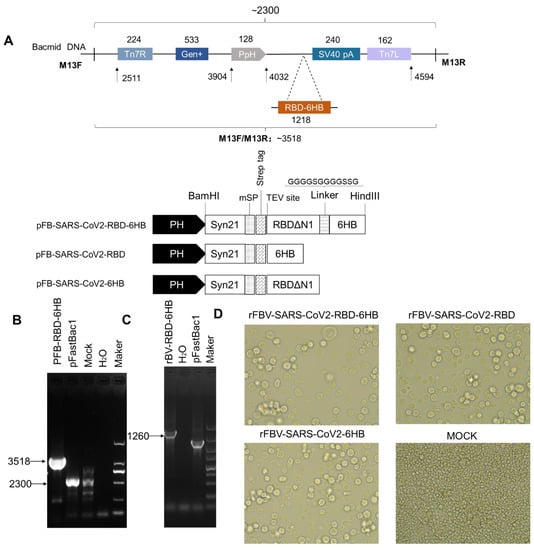 2.1. Recombinant Baculovirus Expressing Exogenous Genes Was Rescued in Sf9 Cells Using the Recombinant Bacmid