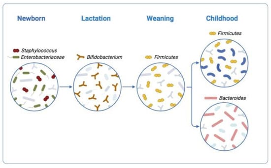 The long coevolution between the human host and the gut microbial community (gut microbiota) has established a strict interaction between them; the microbiota outnumbers somatic and germ cells of the human body 10-fold [1] and the number of the human genes 100-fold [2]. The gut microbiota is rich in genes that provide energy or encode enzymes involved in the carbohydrate metabolism, such as glycoside hydrolases and lyases [3]. Humans instead have few of these genes. Yet, humans consume diets rich in carbohydrates, including fibers. The solution to this puzzle comes from the cooperation between the two partners: the host providing glycans and the gut microbiota monosaccharides and disaccharides derived from the fiber present in the diet and not digested by the host. Finally, monosaccharides and disaccharides enrich of nutrients the diet of both: gut microbiota and host. Furthermore, the gut microbiota provides vitamin B12, biotin, and folic acid. B12 is particularly important since it mediates both host–microbe and microbe–microbe interactions [4]. The majority of the bacterial species encode multiple corrinoid transporters and corrinoid-dependent enzymes, but do not produce de novo corrinoids (molecules containing four pyrrole rings similar to porphyrins) [5]. Rather, corrinoids acquire and convert those produced by other bacteria present in the environment. Why do bacteria not synthetize de novo corrinoids? The answer is that bacteria expressing a corrinoid with a new ligand may gain a competitive edge in that niche over bacteria that do not express this ligand [6]. Experiments in gnotobiotic mice (mice colonized with specific microbial species) have confirmed in vivo (in a mammalian gut) the microbial fitness of single corrinoids. In conclusion, we expect that the differences between corrinoids—properly deciphered—might help to detect new biomarkers of environmental enteric dysfunctions [7] and help to better understand how corrinoids regulate gene expression in bacteria microbiota [8]. During the first year of life, in the gut microbiota of newborns several Bifidobacterium species prevail, able to metabolize the oligosaccharides present in the maternal milk [9]. Alternatively, after weaning Firmicutes and Bacteroides phyla prevail, which supervise the development of the adaptive immune system and provide nutrients to the microbiota [10] (Figure 1).