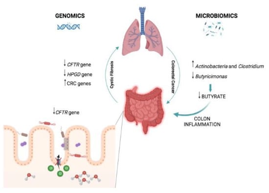 Cystic fibrosis (CF) patients have a 5–10-fold higher risk of developing colorectal cancer (CRC). The first clue that CF and CRC might share several risk factors was finding that the genome of CF patients is enriched in CRC genes controlling immune response, cell adhesion, and viral infection. Further, the taxa of gut microbiota associated with CF (Actinobacteria and Clostridium) are enriched in CRC patients as well [29]. Furthermore, the two tumor suppressor genes, CFTR and HPGD—known to predispose to colorectal cancer—result in the downregulated colon of CF patients, who display an increased level of Actinobacteria, but a decreased level of butyrate-producing bacteria (such as Butyricimonas). Butyrate promotes growth and exerts anti-inflammatory activity, both highly important properties protecting the colon [30]. Reduced level of butyrate is also found in CRC patients [29]. In conclusion, though all the pathogenetic mechanisms of CF at present are not clear, the above studies show that the host gut microbiota—inducing high levels of pathogenic bacteria (Ruminococcaceae) and low levels of butyrate—has a decisive role in promoting carcinogenesis in the gut of CF patients (Figure 3). The data reported above might facilitate the discovery of new drugs against CRC and be used as potential biomarkers for an early detection of CRC in CF patients.