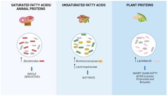 Influence of diet on microbiota composition. Saturated fatty acids and animal protein consumption increases the risk of cardiovascular diseases; unsaturated fatty acids and plant protein consumption protect against inflammation.